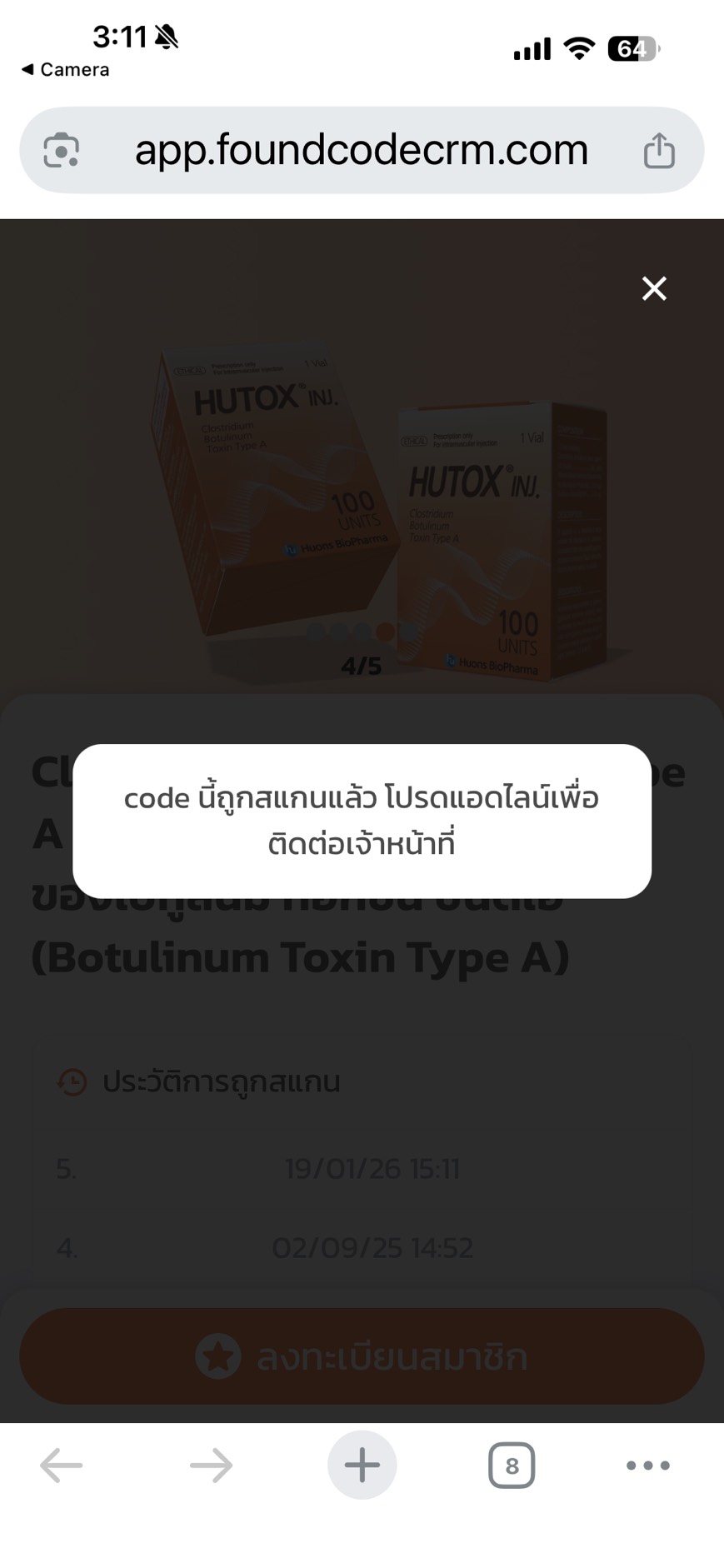 - ระบบจะขึ้นข้อมูลประวัติการถูกสแกน โดยระบุวันและเวลา จำนวนไม่เกิน 3 ครั้ง หรือขึ้นข้อความแจ้งเตือนว่า “code นี้ถูกสแกนแล้ว โปรดแอดไลน์เพื่อติดต่อเจ้าหน้าที่”